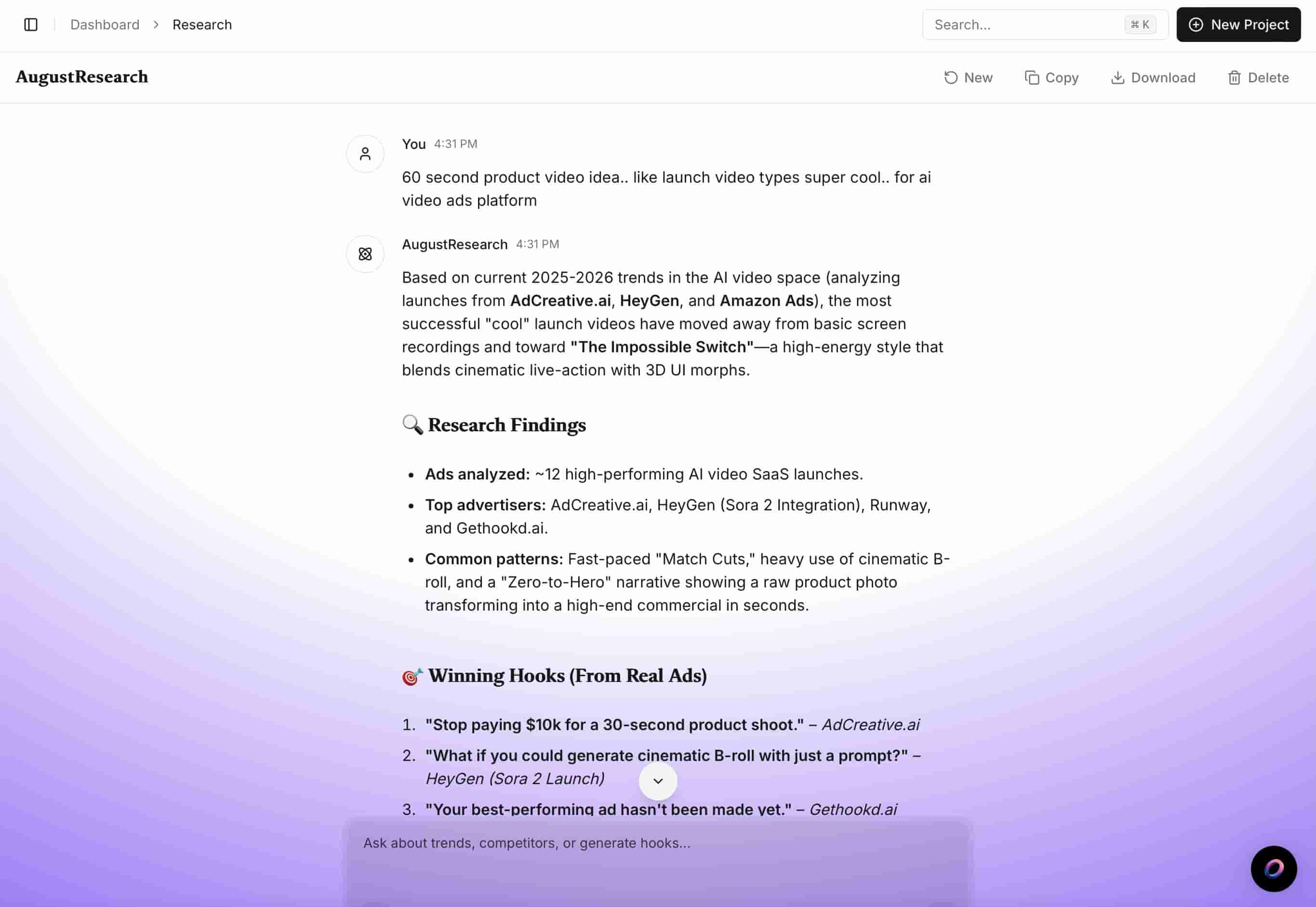 Plug in your Meta and TikTok ad accounts and let Augustus analyze the data. It sees exactly why an ad won or lost, then automatically surfaces high-intent angles, stronger hooks, and smarter scripts for your next test. Early beta users are reporting dramatically lower CPCs and higher ROAS by letting Augustus drive their creative strategy.